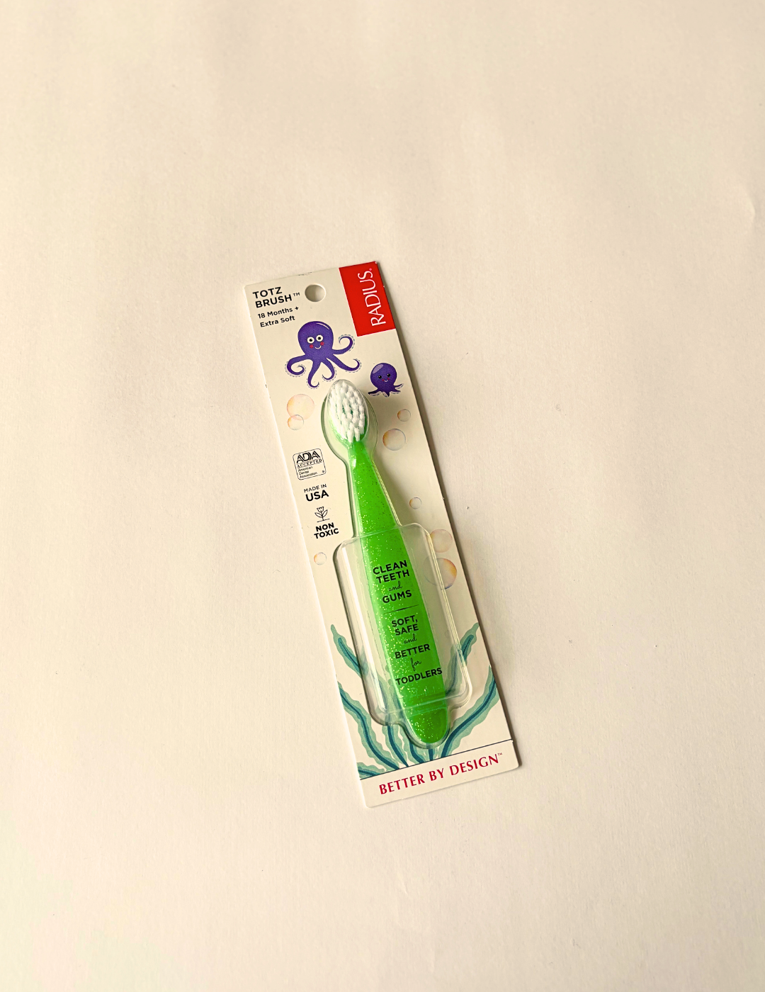 Certificado por la Administración de Alimentos y Medicamentos (FDA), Totz es suave pero eficaz y totalmente libre de productos químicos nocivos como BPA y colorantes sintéticos. Gracias a sus colores y destellos llamativos, es un cepillo garantizado para niños de 18 meses en adelante.
