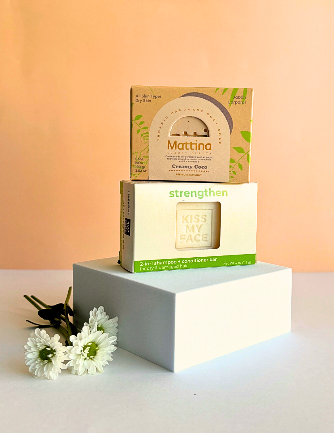 Nuestro pack "Beauty hair & body" inlcuye: un jabón de cuerpo + un shampoo en barra kiss my face