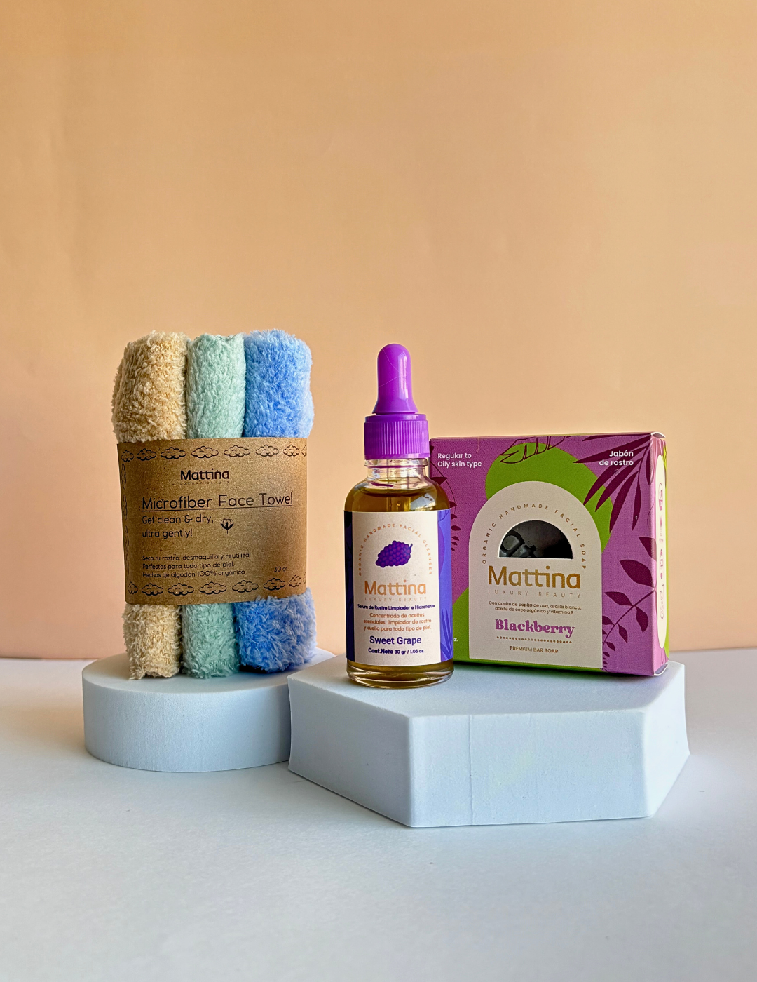 Nuestro pack "Soft" incluye: serum facial limpiador e hidratante + toallas de microfibra algodón orgánico + jabón de rostro